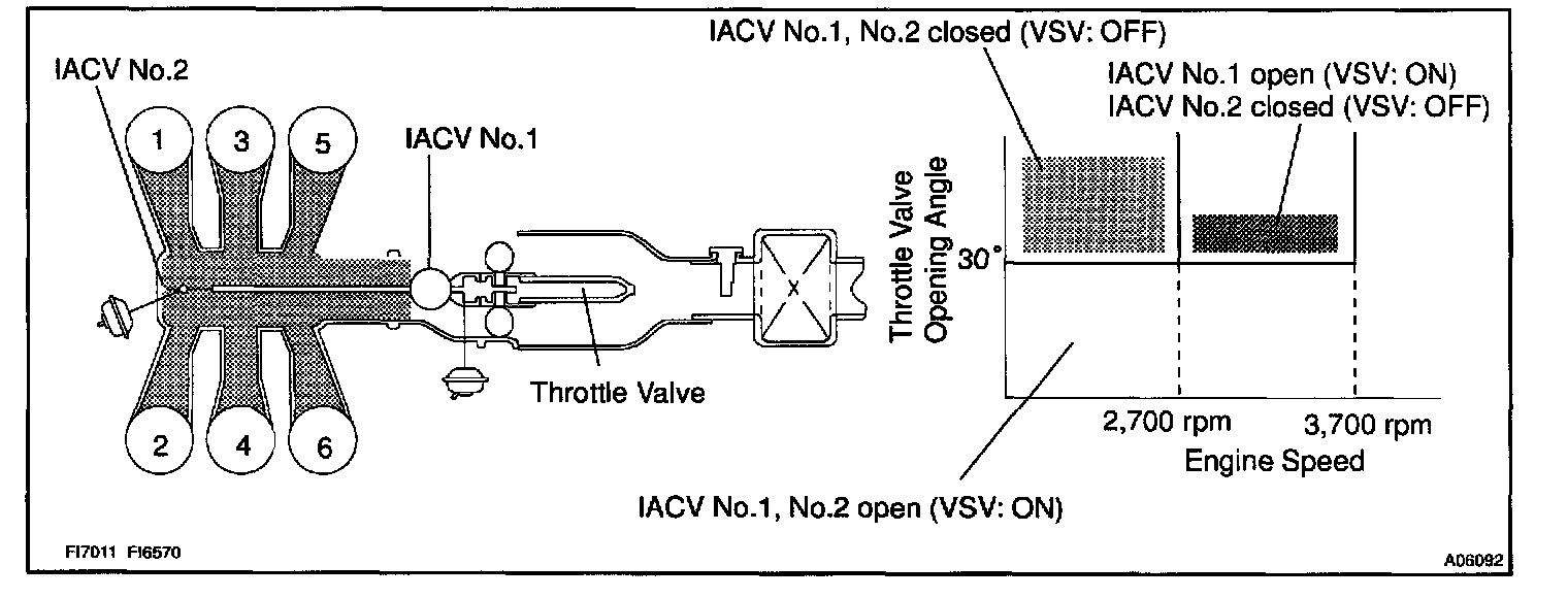 When the engine speed is 3,700 rpm or less and the throttle valve opening angle is 300 or more, the ECM turns the two VSV ON or OFF and operate the IACV.