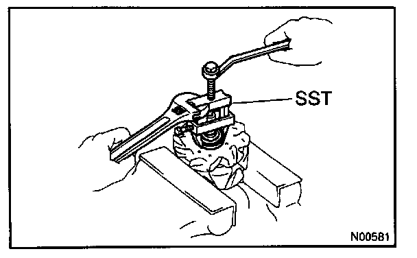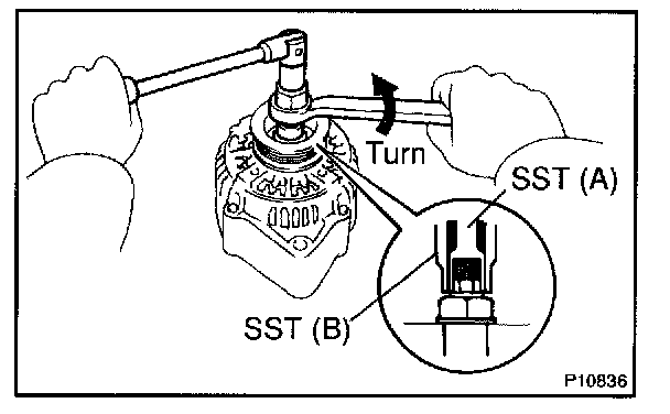 e. To loosen the pulley nut, turn SST (A) in the direction shown in the illustration.
