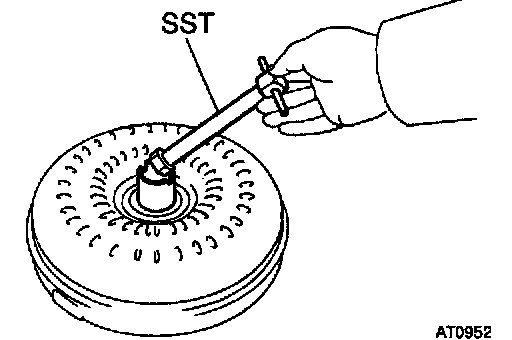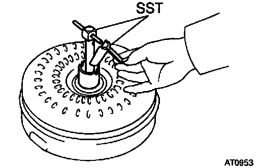 b. Install SST so that it fits in the notch of the converter clutch hub and outer race of the one-way clutch.