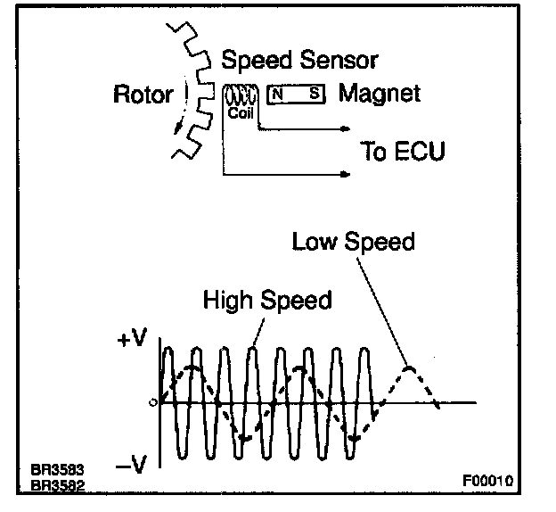 When the rotors rotate, a magnetic field emitted by a permanent magnet in the speed sensor generates an AC voltage. Since the frequency of this AC voltage changes in direct proportion to the speed of the rotor, the frequency is used by the ECU to detect the speed of each wheel.