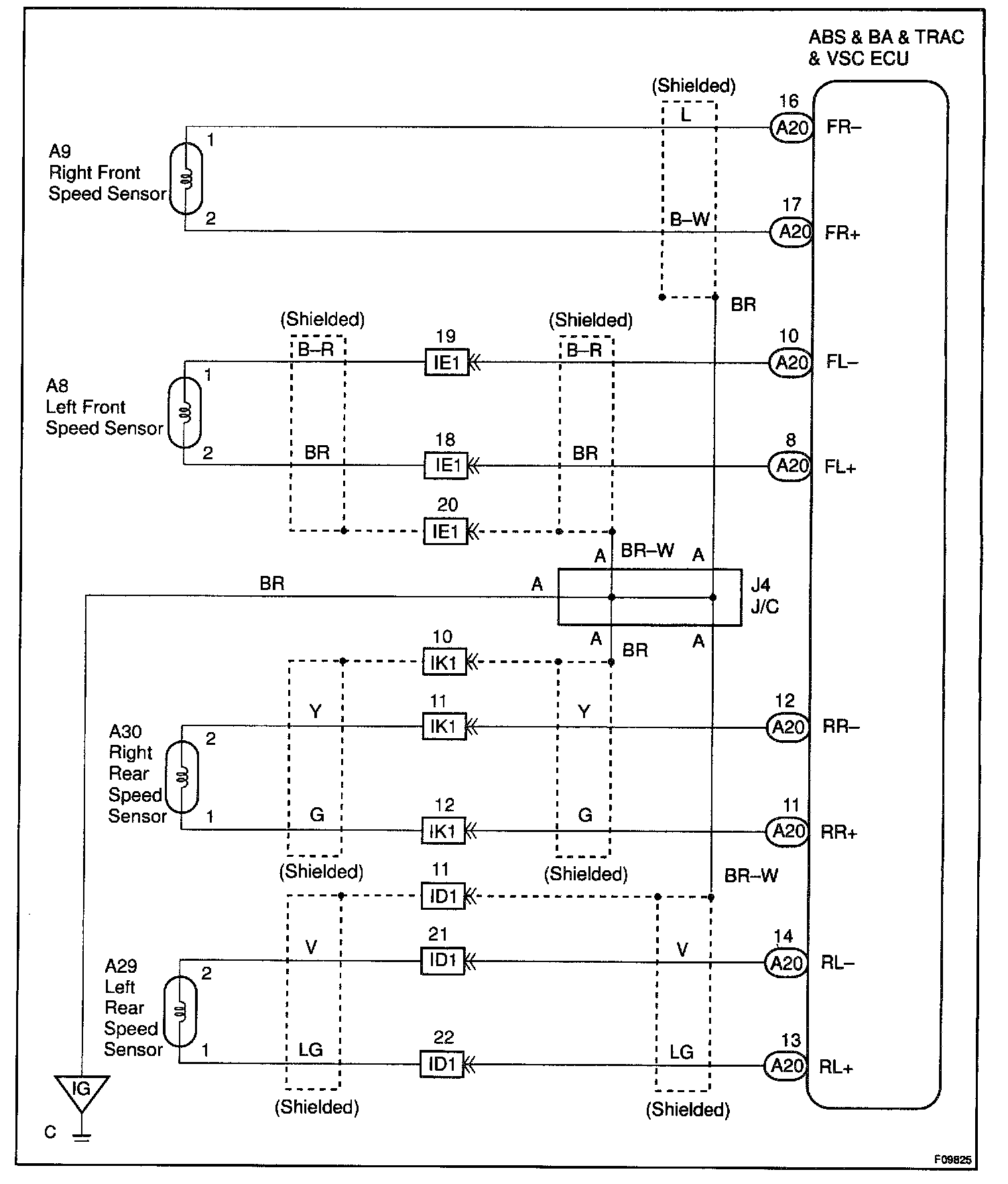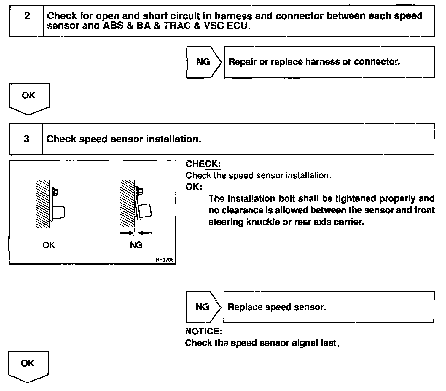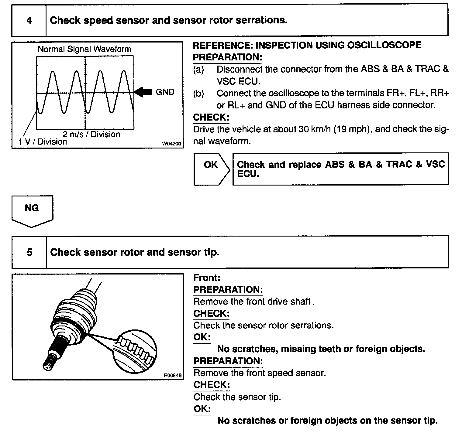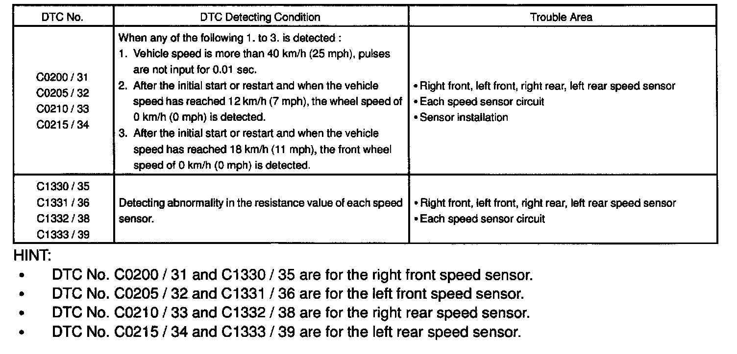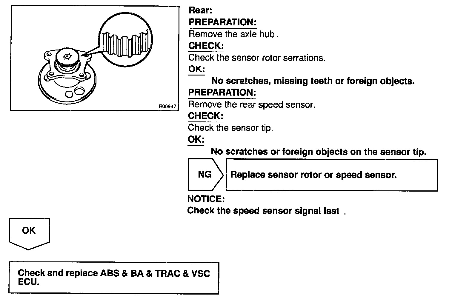 The speed sensor detects a wheel speed and sends the appropriate signals to the ECU. These signals are used to control of the ABS and VSC system. Each of the front and rear rotors has 48 serrations.