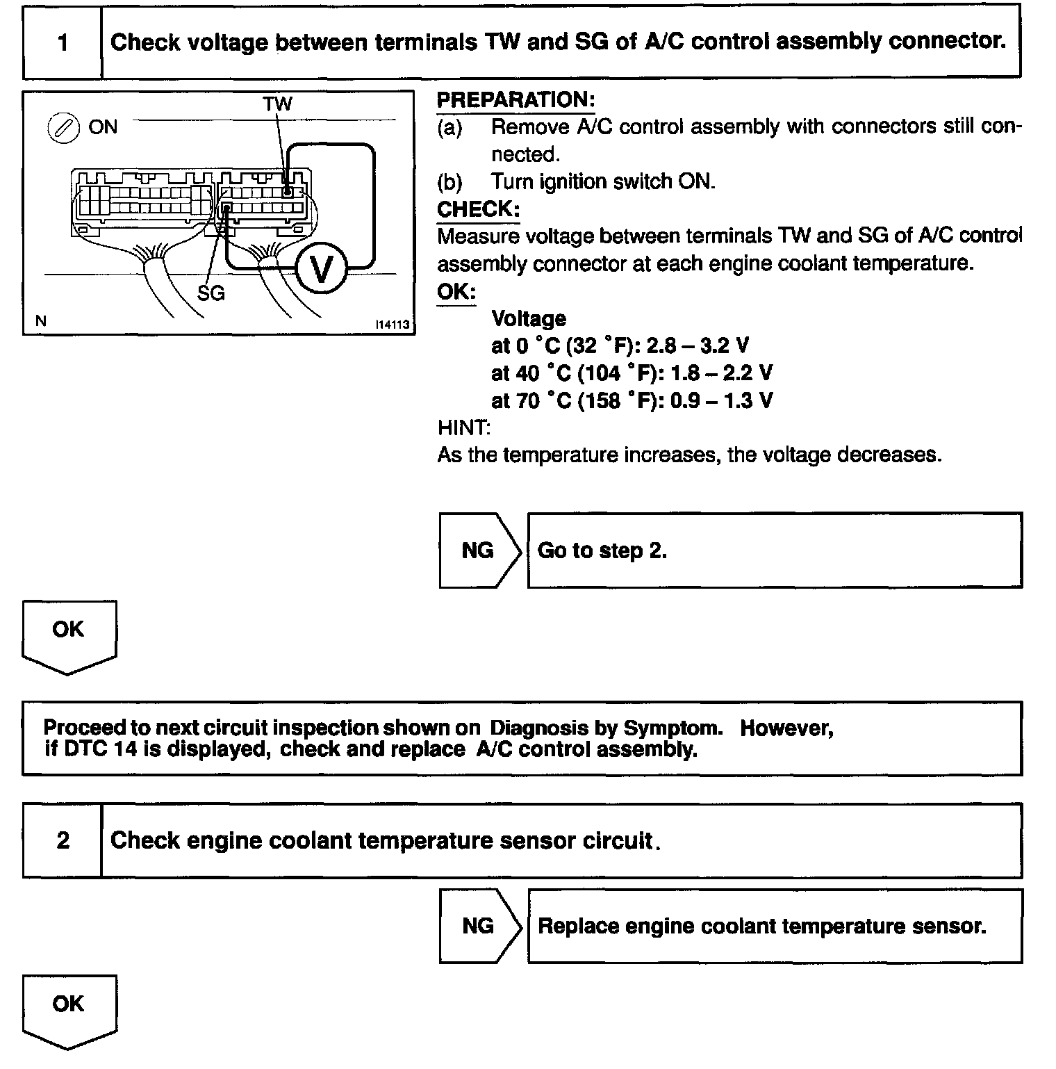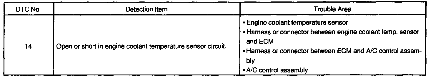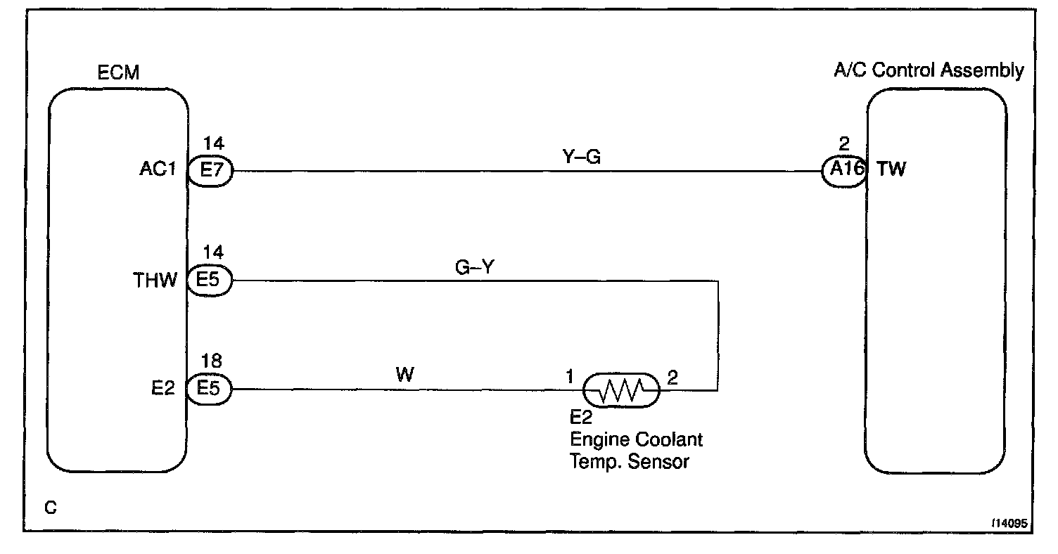 This sensor detects the engine coolant temperature and sends the appropriate signals to the A/C control assembly. These signals are used for warm up control when the engine is cold.