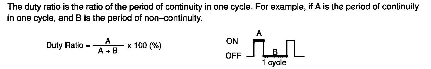 The duty ratio is the ratio of the period of continuity in one cycle. For example, if A is the period of continuity in one cycle, and B is the period of non-continuity.
