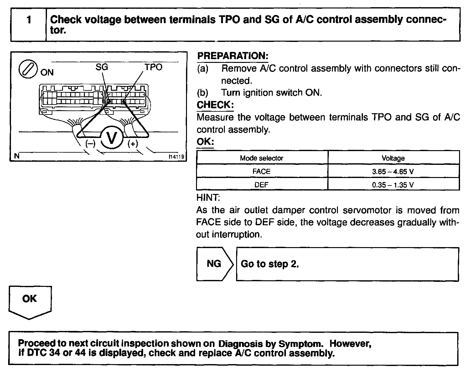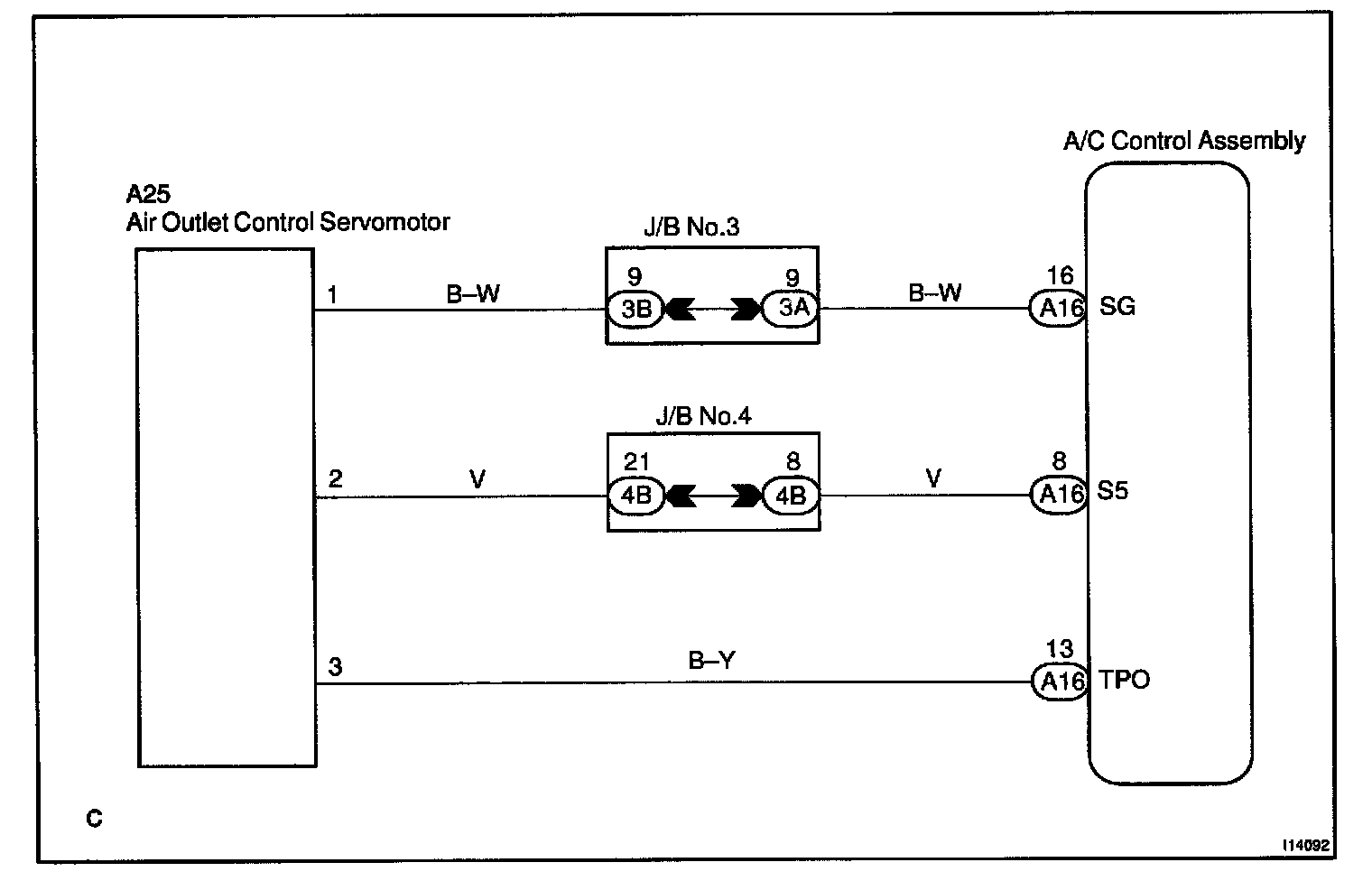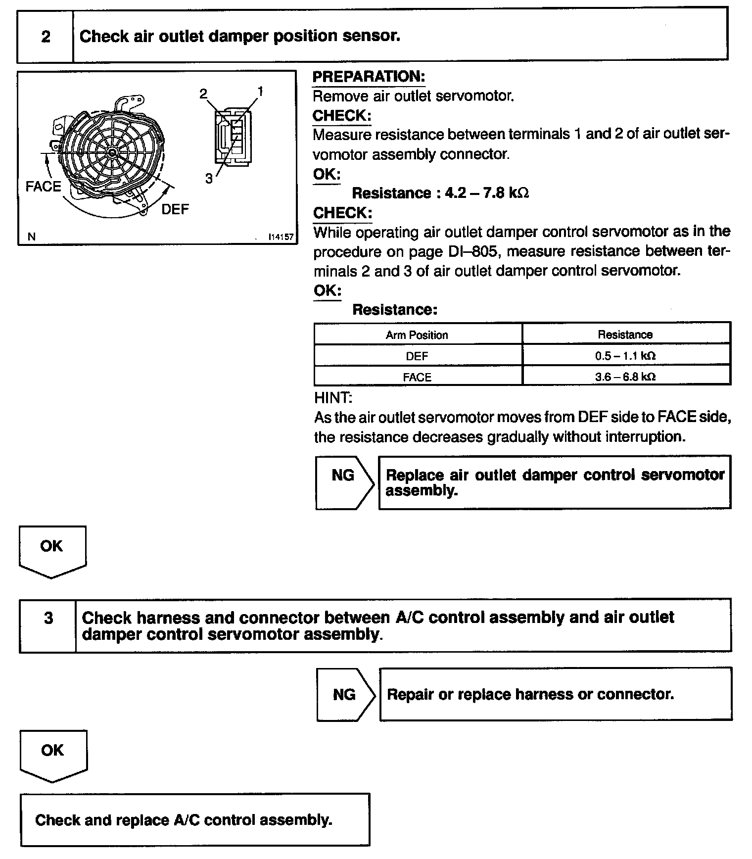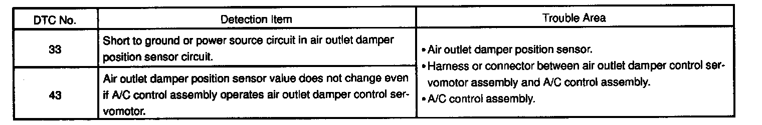 This sensor detects the position of the air outlet damper and sends the appropriate signals to the A/C control assembly. The position sensor is built into the air outlet damper control servomotor assembly.