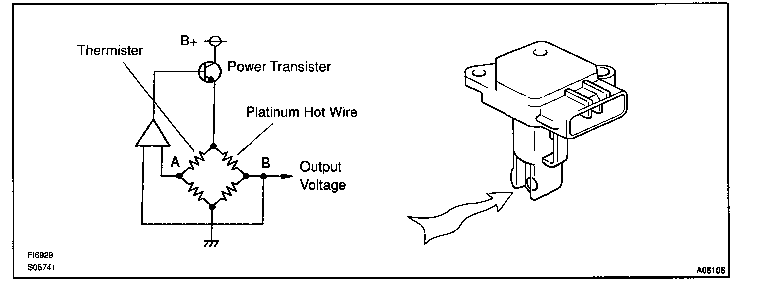 The mass air flow meter uses a platinum hot wire. The hot wire air flow meter consists of a platinum hot wire, thermistor and a control circuit installed in a plastic housing. The hot wire air flow meter works on the principle that the hot wire and thermistor located in the intake air bypass of the housing detect any changes in the intake air temperature.