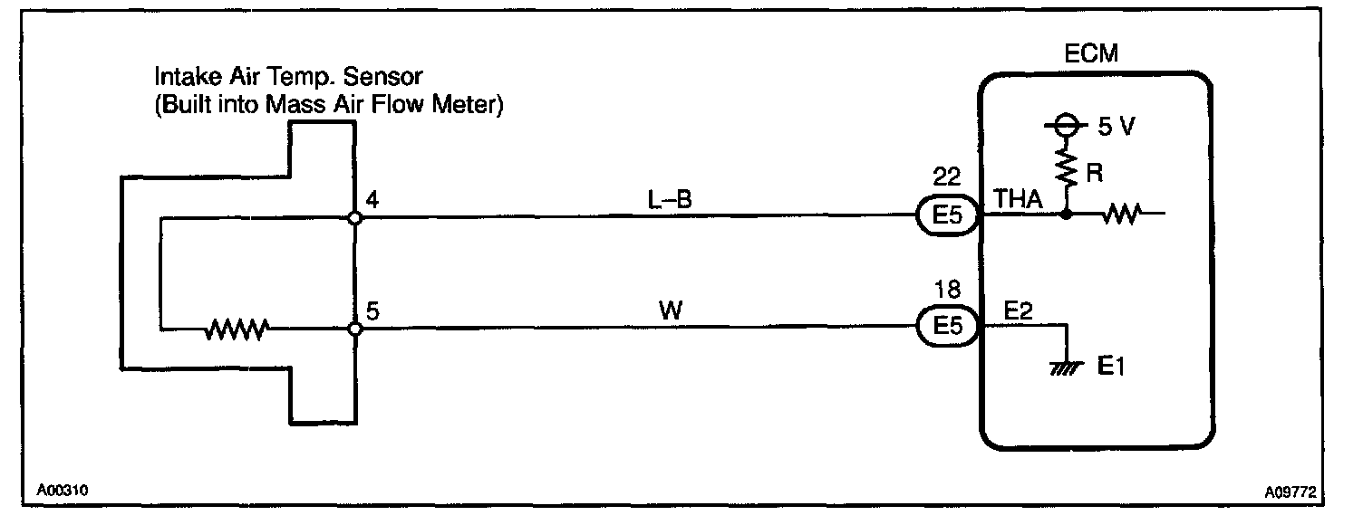 The intake air temperature sensor is connected to the ECM. The 5 V power source voltage in the ECM is applied to the intake air temperature sensor from terminal THA via resistor R. That is, resistor R and the intake air temperature sensor are connected in series. When the resistance value of the intake air temperature sensor changes in accordance with changes in the intake air temperature, the potential at terminal THA also changes. Based on this signal, the ECM increases the fuel injection volume to improve driveability during cold engine operation.