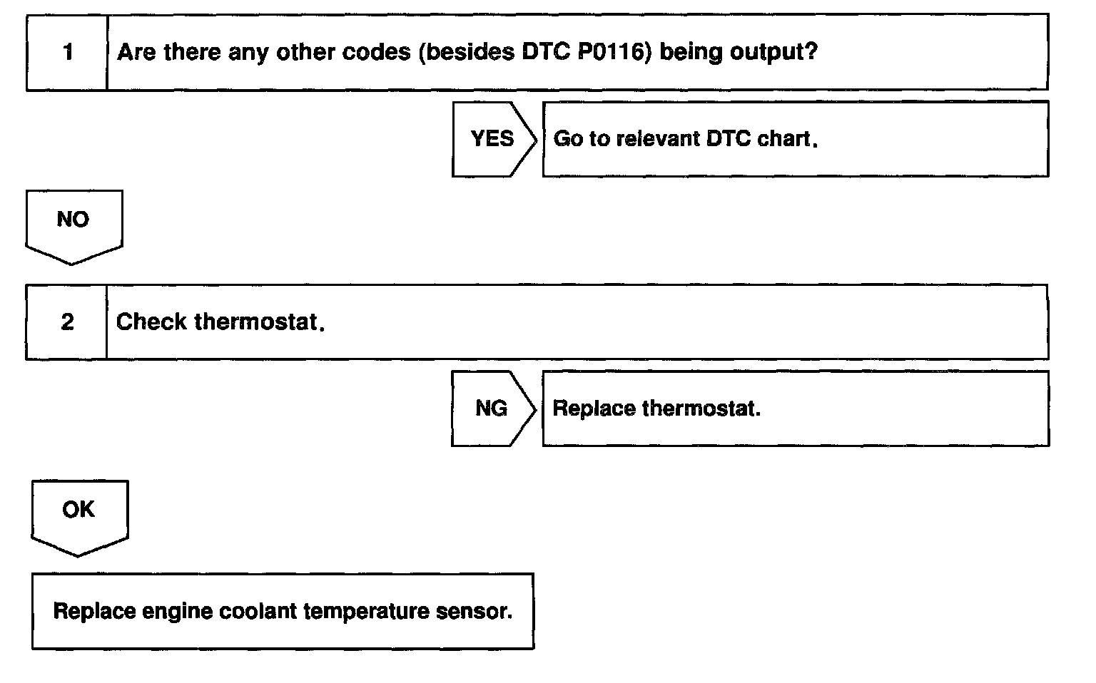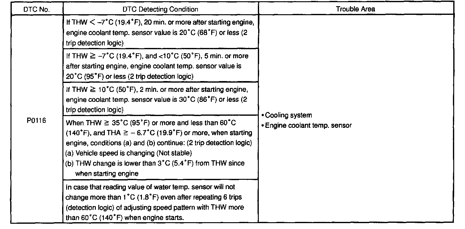 - If DTCs P0115 and P0116 are output simultaneously, engine coolant temperature sensor circuit may be open. Perform troubleshooting of DTC P0115 first.