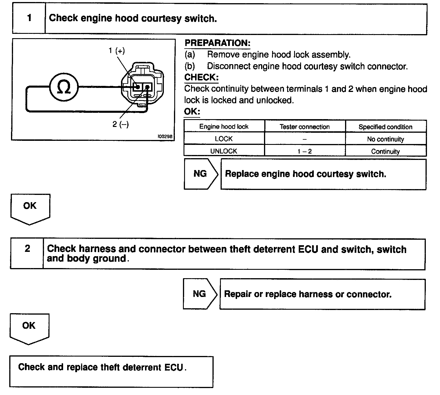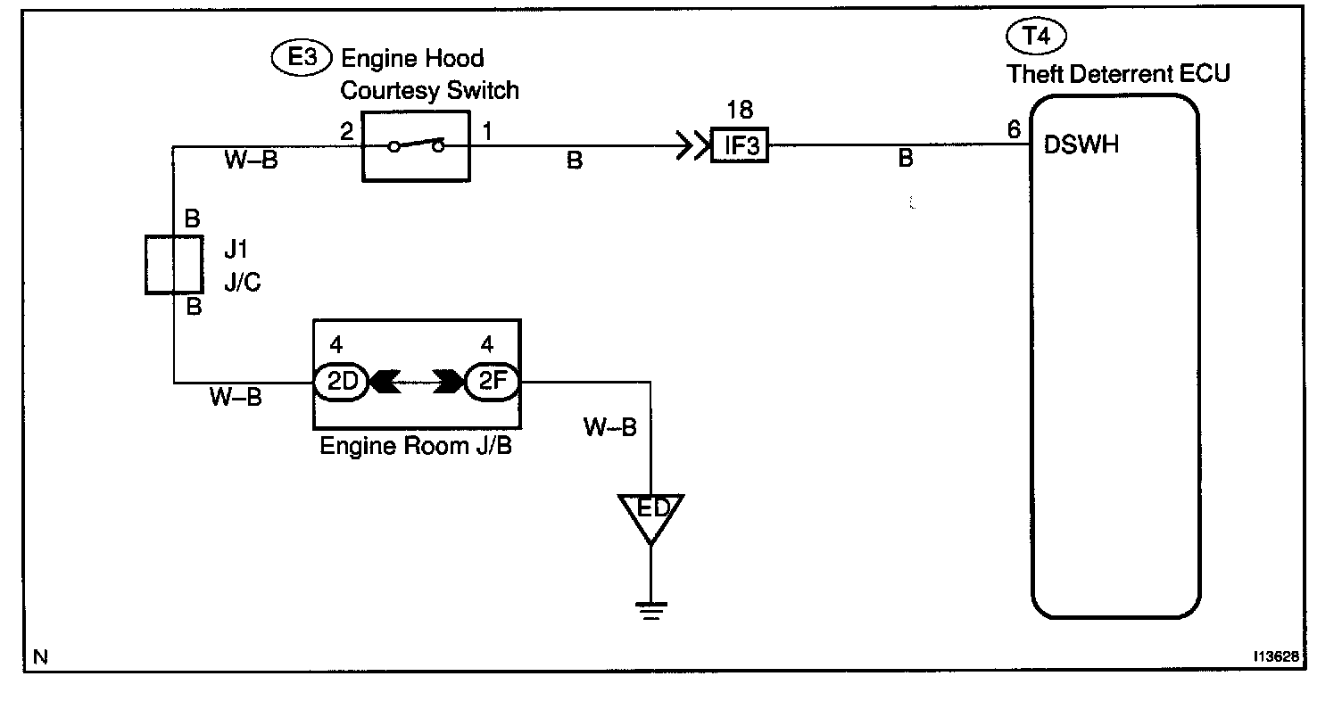 CIRCUIT DESCRIPTIONThe engine hood courtesy switch is built into the engine hood lock assembly and goes ON when the engine hood is opened and goes OFF when the engine hood is closed.