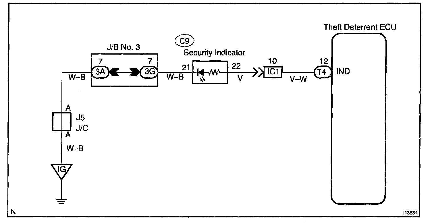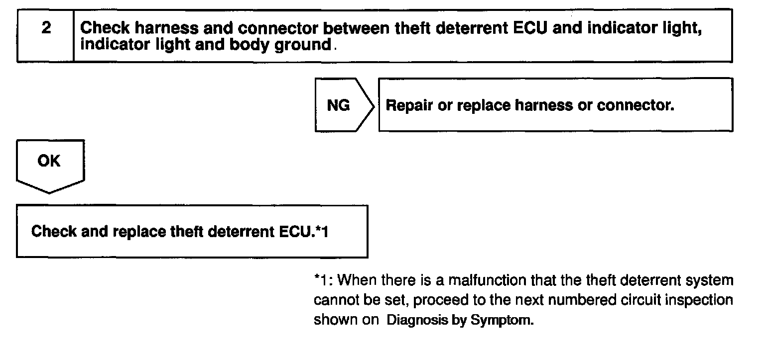 CIRCUIT DESCRIPTIONWhen the theft deterrent system is preparing to set, this circuit lights up the indicator light. When the system has been set, it continuously turns the indicator light on for 0.75 secs. and turns it off for 1.25 secs., thus blinking the indicator light.