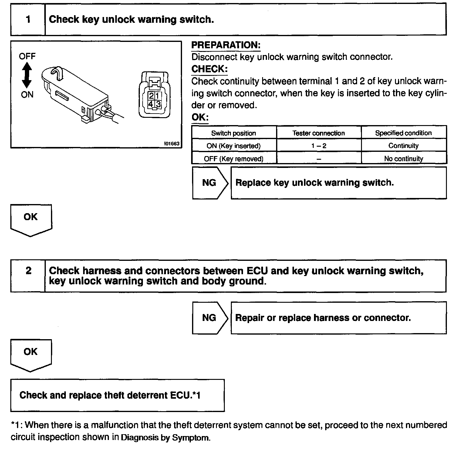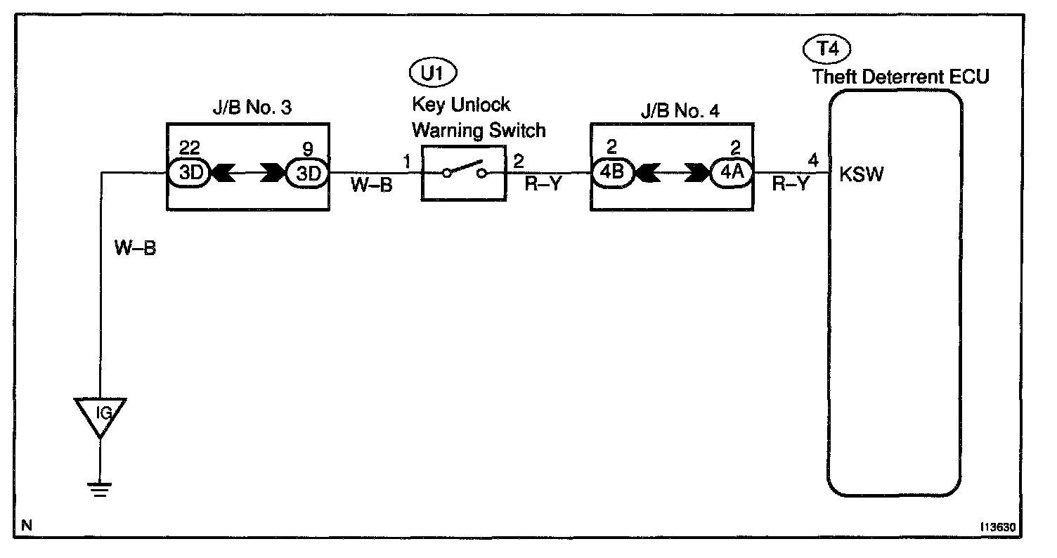 CIRCUIT DESCRIPTIONThe key unlock warning switch goes ON when the ignition key is inserted in the key cylinder and goes OFF when the ignition key is removed.
