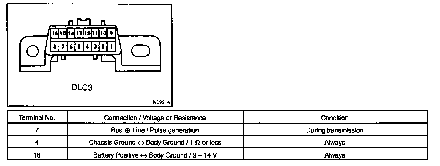 The vehicle's ECM uses ISO 14230 for communication. The terminal arrangement of DLC3 complies with SAE J1962 and matches the ISO 14230 format.