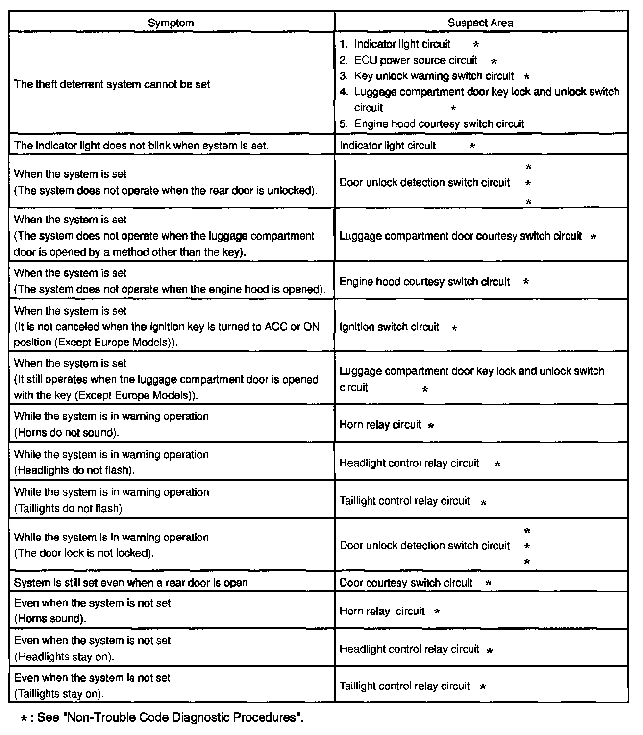 HINT: Troubleshooting of the theft deterrent system is based on the premise that the door lock control system is operating normally. Accordingly, before troubleshooting the theft deterrent system, first make certain that the door lock control system is operating normally.