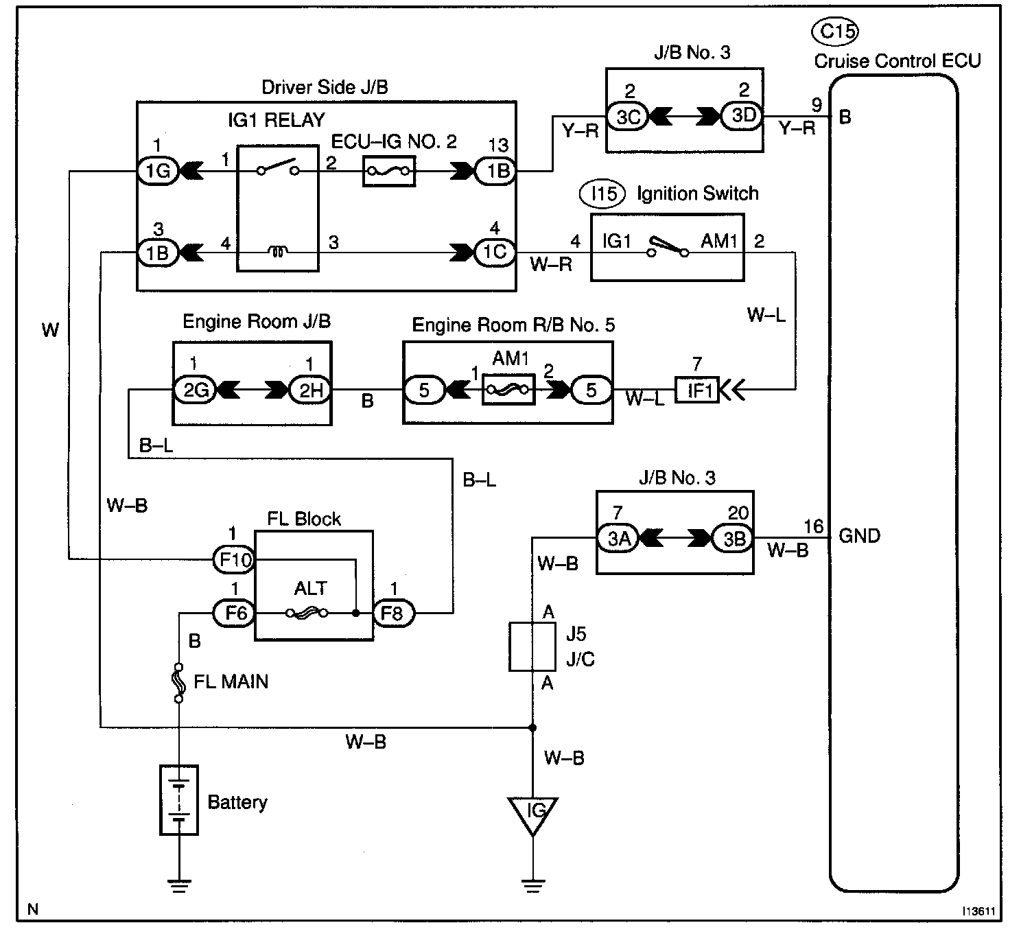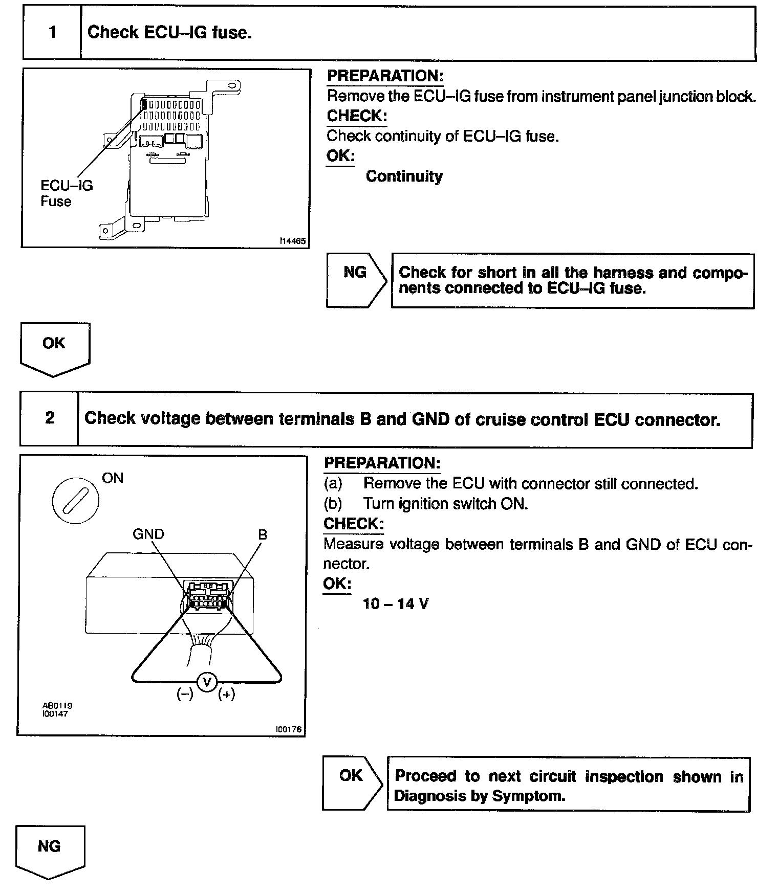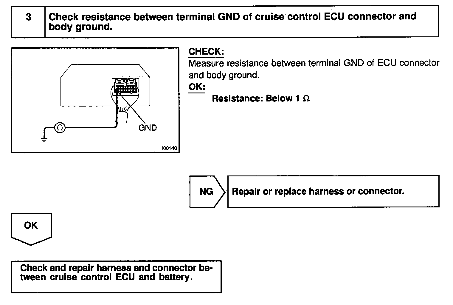 The ECU power source supplies power to the actuator and sensors, etc., when terminal GND and the cruise control ECU case are grounded.
