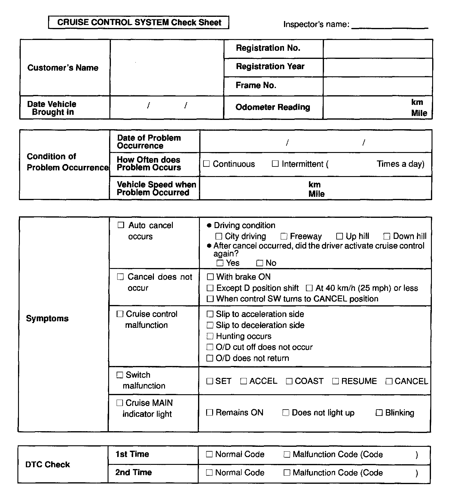 Cruise Control System Check Sheet: