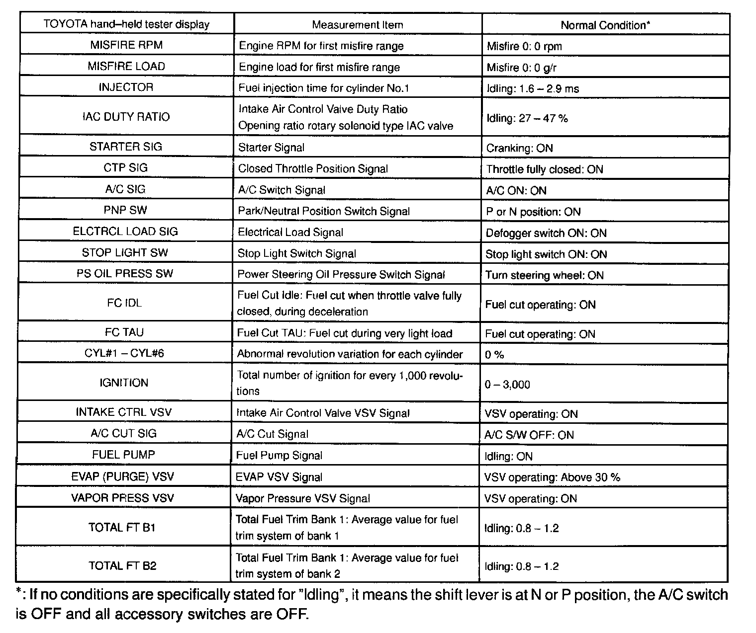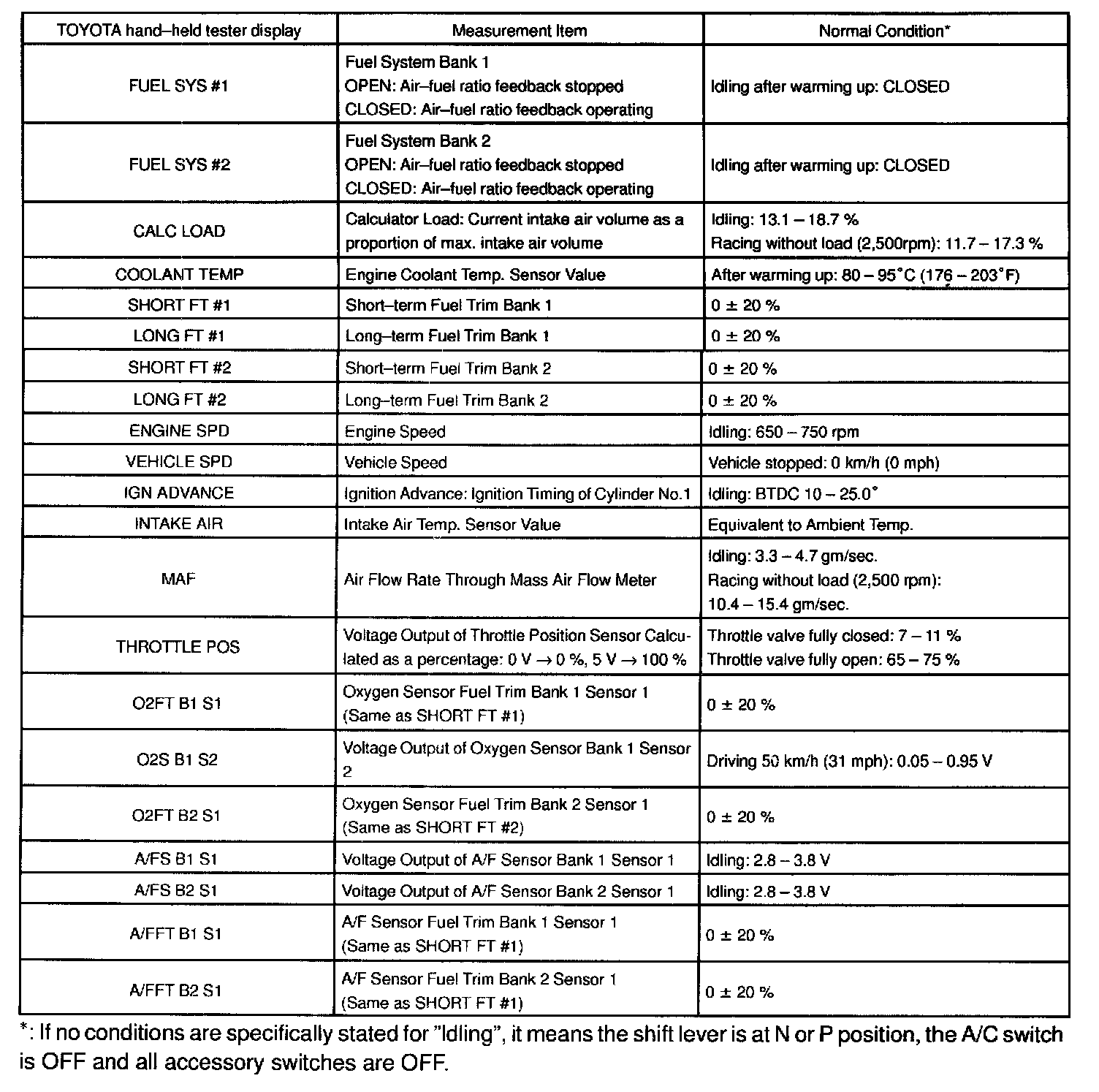 NORMAL ENGINE OPERATING CONDITIONNOTE: The values given for "Normal Condition" are representative values, so a vehicle may still be normal even if its value varies differ from those listed here. So do not decide whether a part is faulty or not solely according to the "Normal Condition" here.