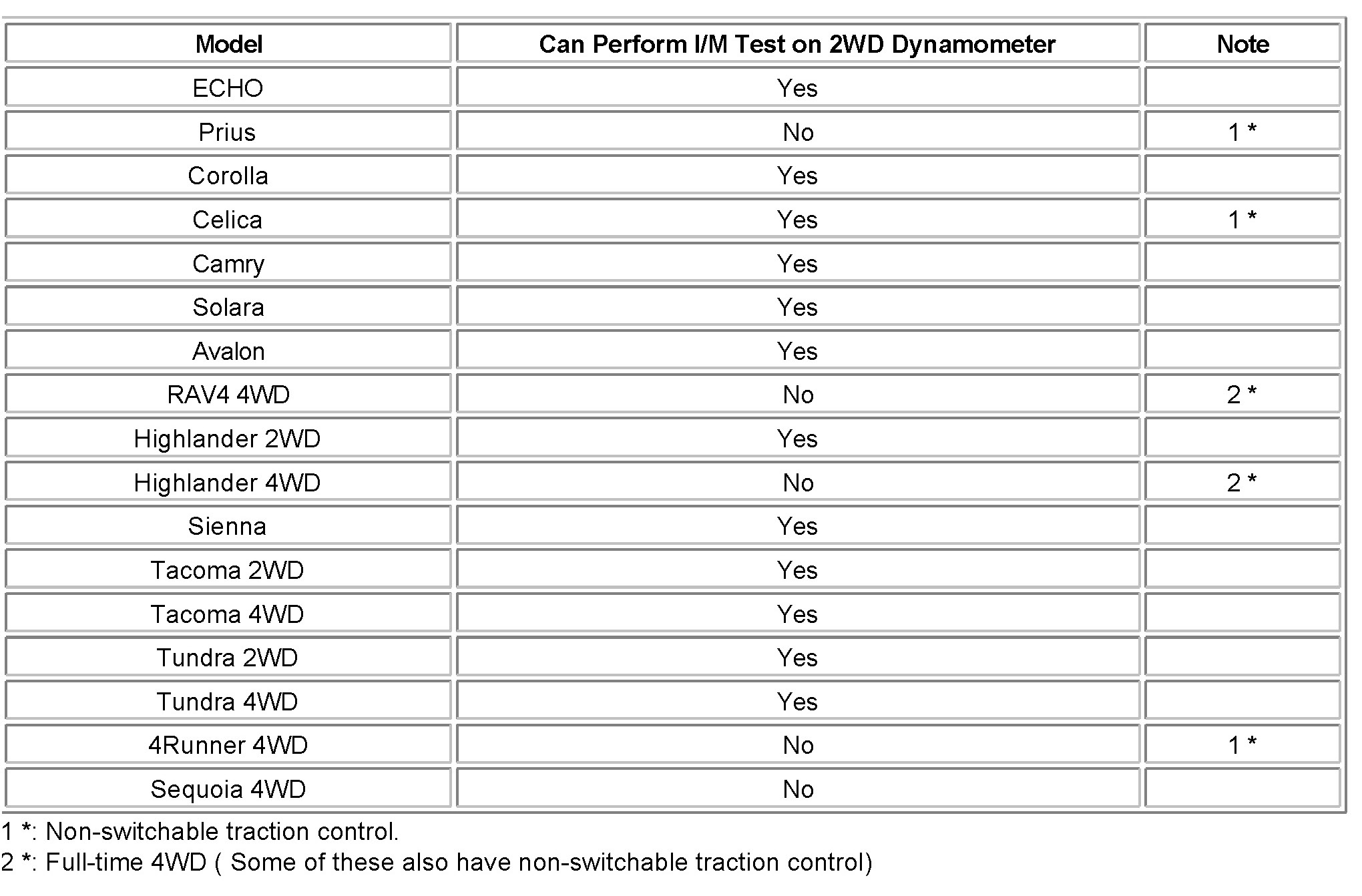 Some provincial Inspection/Maintenance (I/M) programs require a loaded mode test conducted on a dynamometer. A loaded mode test using a 2WD dynamometer cannot be performed on vehicles with full time four wheel drive or "non-switchable" traction control vehicles. A list of these vehicles is provided below for 2001 models.