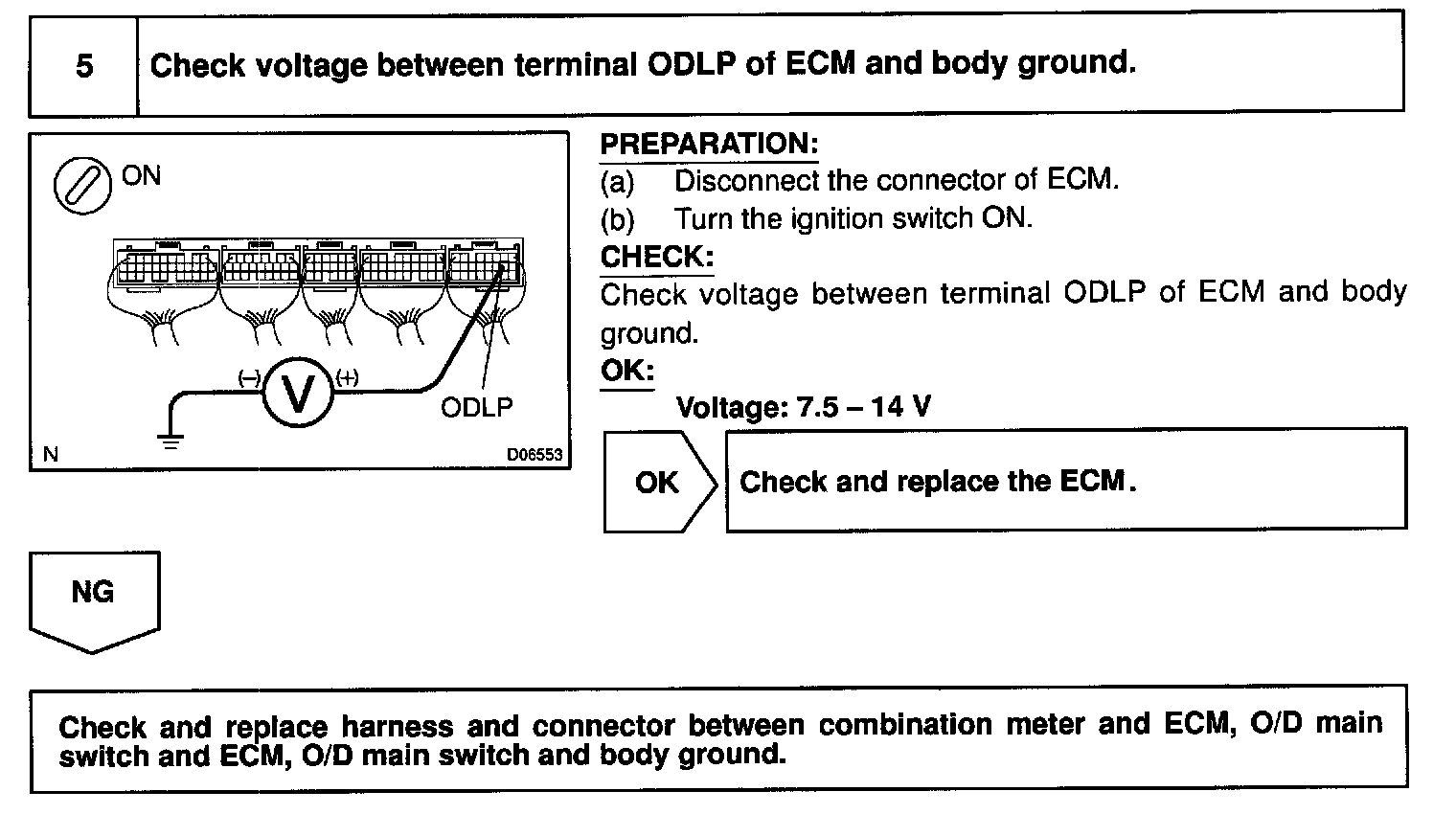 CIRCUIT DESCRIPTIONThe O/D main switch is a momentary type switch. When pressing the O/D OFF main switch, the O/D OFF indicator light lights up and ECM prohibits shifting to O/D, and when pressing it again, the O/D OFF indicator light goes off and ECM allows shifting to O/D. Turning the IG switch OFF will reset the O/D OFF indicator light.