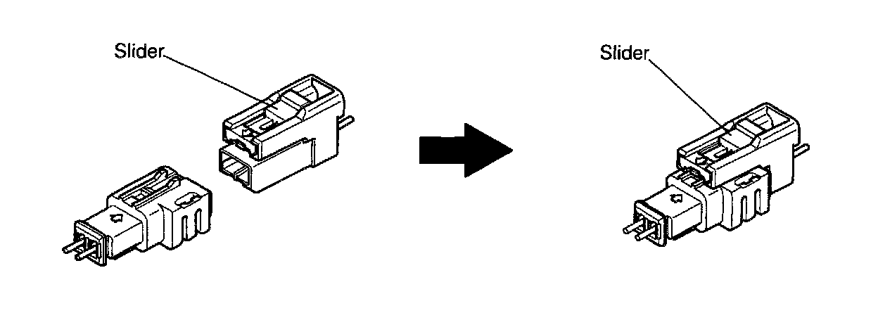 a. Align a lock part of male connector and a slider of female connector in the same direction as shown in the illustration, fit in them without rubbing.