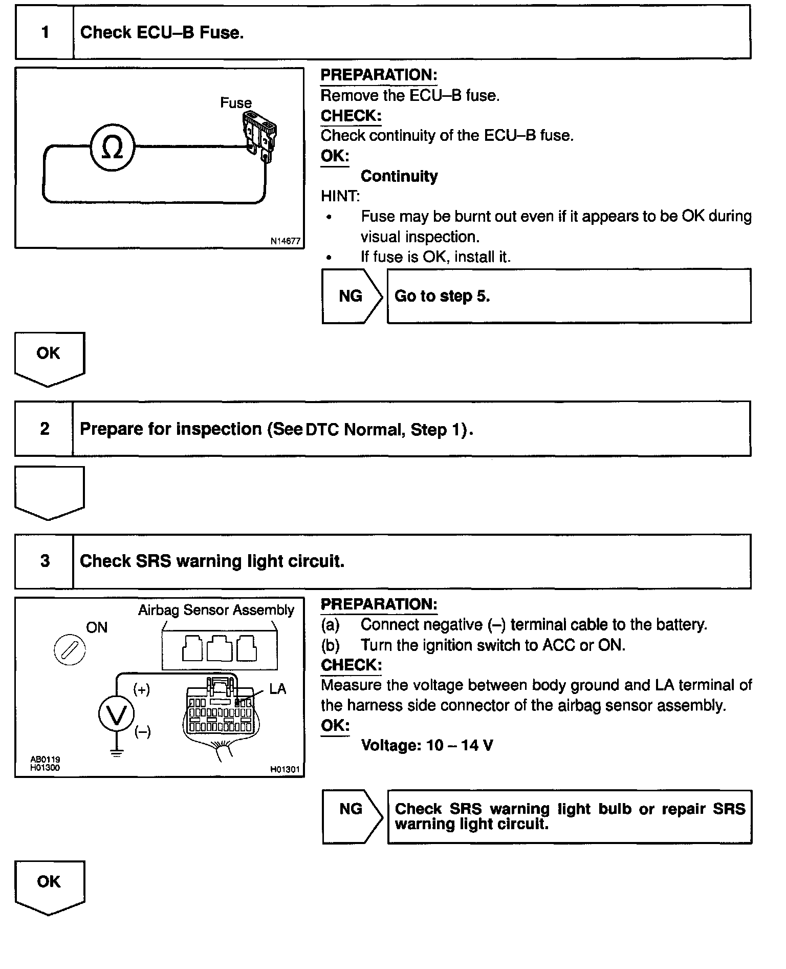 If there is a malfunction in the SRS, the SRS warning light lights up to inform the driver of the abnormality. When terminals Tc and E1 of the [1][2]DLC1 are connected, the DTC is displayed by blinking the SRS warning light.