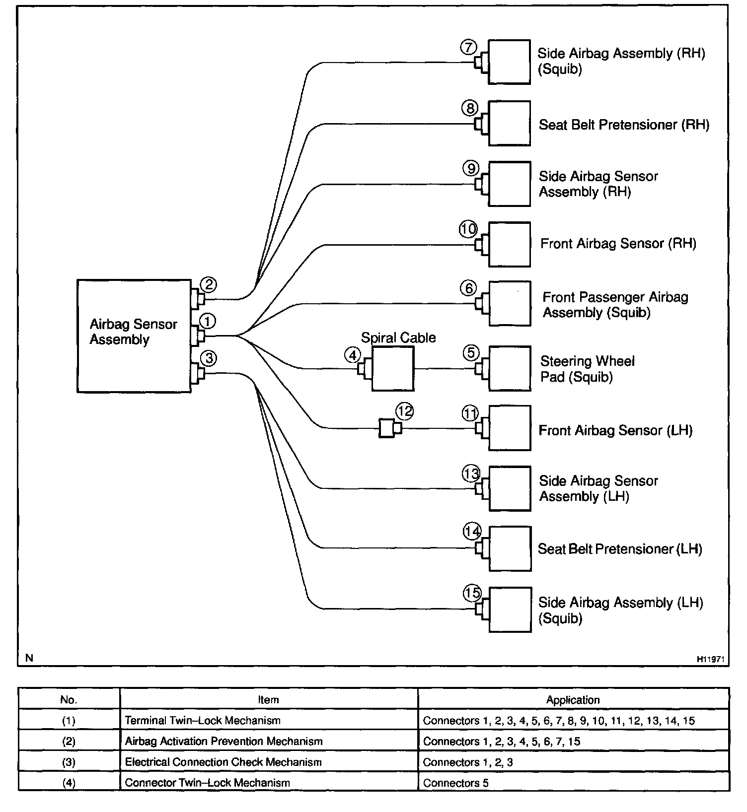 Each connector contains a short spring plate. When the connector is disconnected, the short spring plate automatically connects positive (+) terminal and negative (-) terminal of the squib.