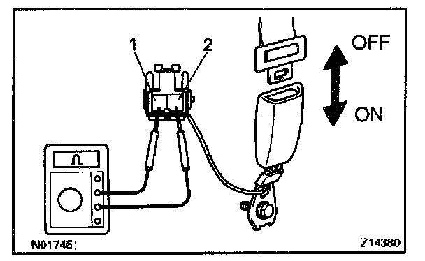 b. Check that no continuity exists between the terminals on the switch side connector with the switch OFF (belt fastened).
