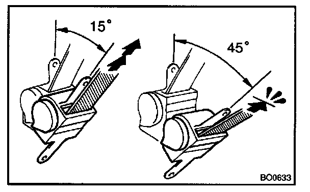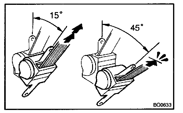 d. Make sure that the belt can be pulled out at a tilt of 15 degrees or less, and cannot be pulled out over 45 degrees of tilt.