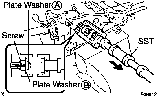 a. Set SST plate washer (18 and 36 mm outer diameter) and screw (4.0 mm diameter, 0.7 mm pitch, 15.0 mm length)as shown in the illustration. And then remove the 2 No. 2 tilt steering bolts.