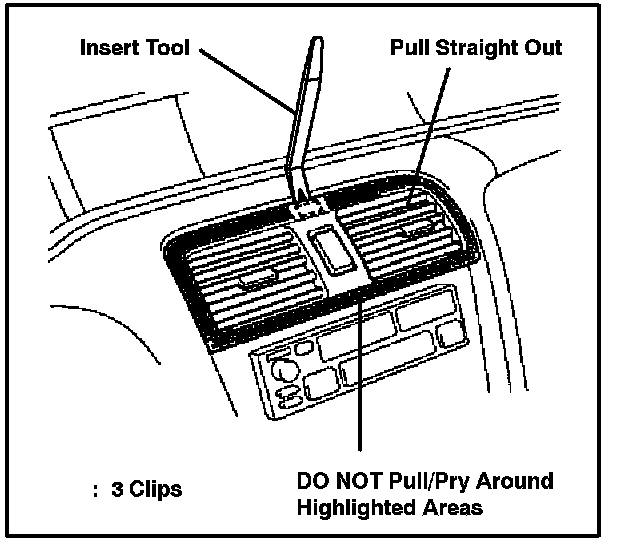 The center register removal procedure has been revised in order to prevent rattles, broken clips, and/or damage. Please follow the procedure below when removing the center register assembly.