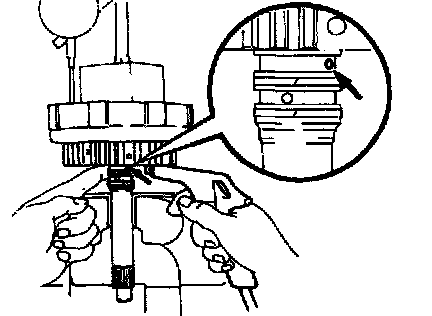 ^ Stop the press when the spring sheet is lowered to the place 1 - 2 mm (0.039 - 0.078 inch) from the snap ring groove, preventing the spring sheet from deforming.