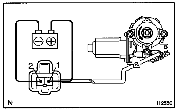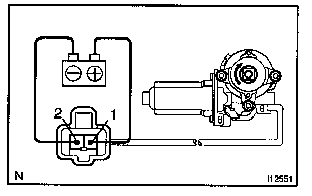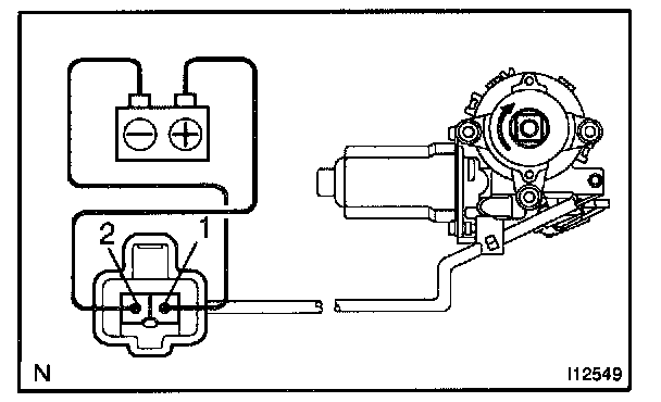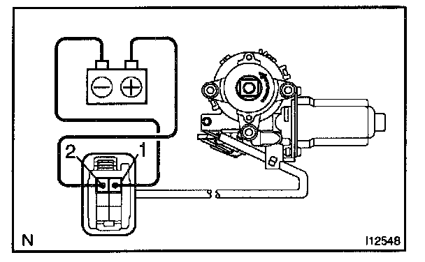 a. Connect the positive (+) lead from the battery to terminal 1 and the negative (-) lead to terminal 2, and check that the motor turns clockwise.