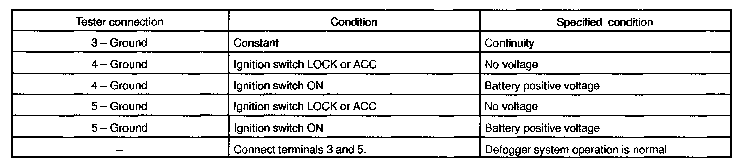 Disconnect the connector from the switch and inspect the connector on the wire harness side, as shown in the table.