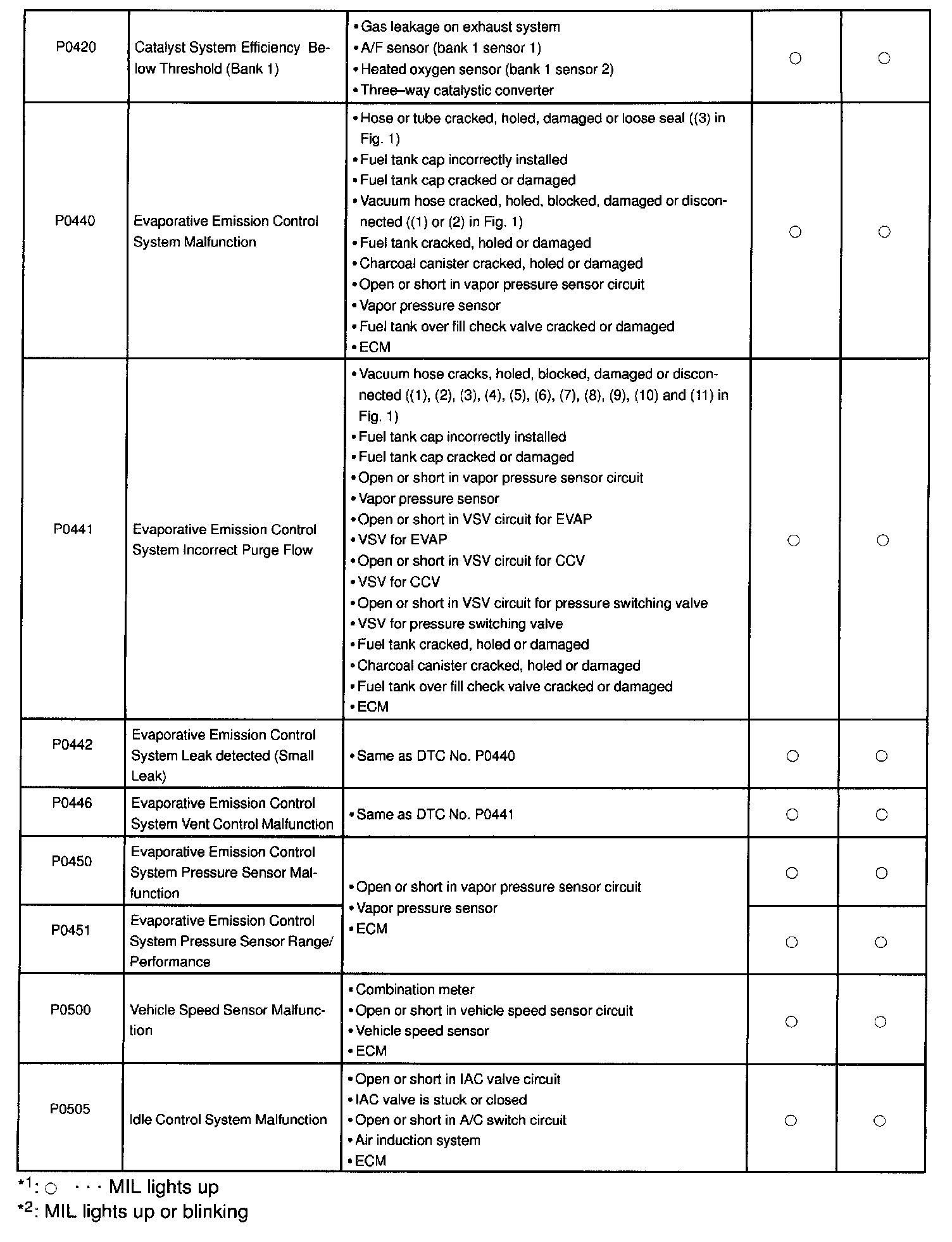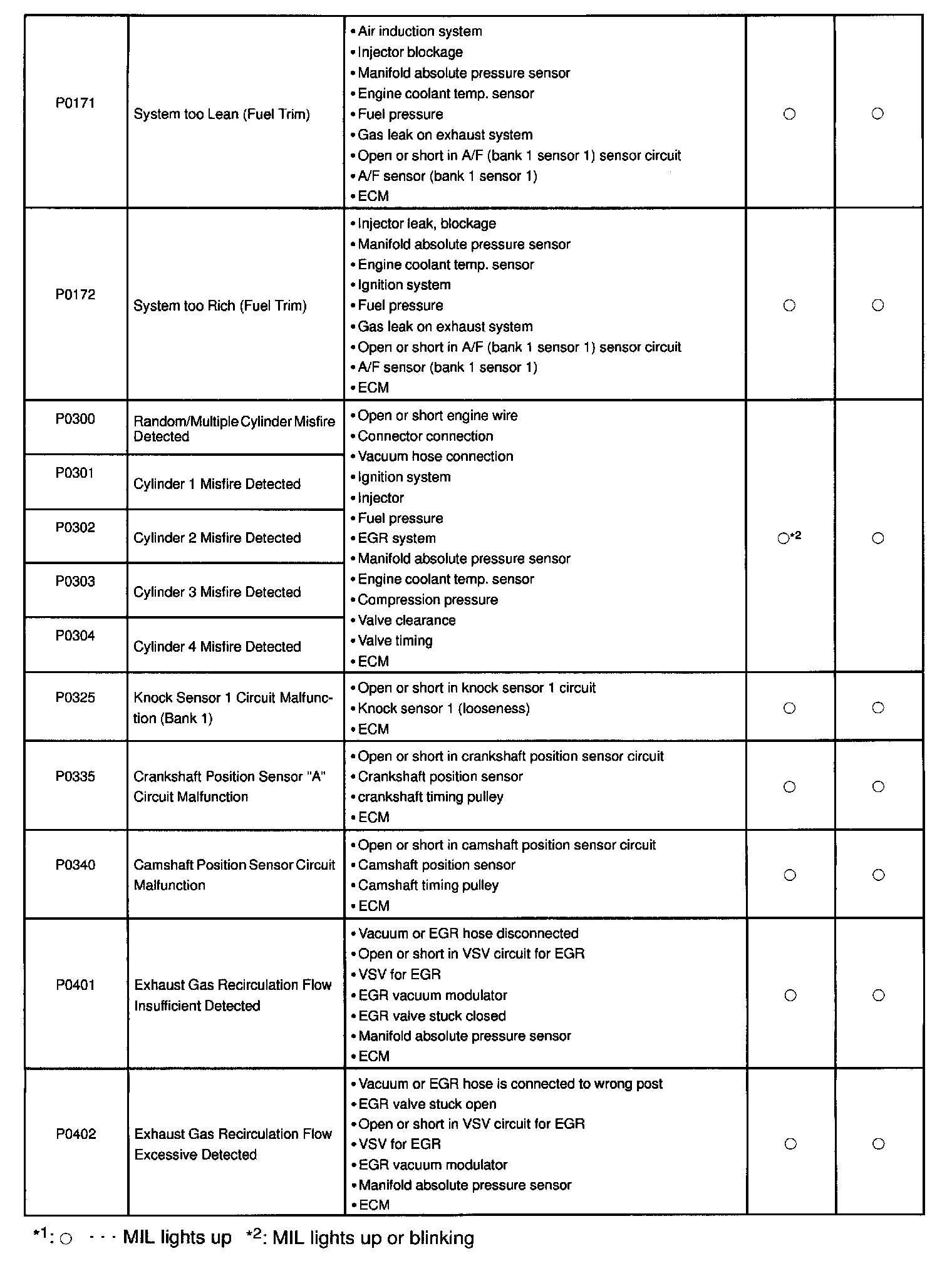 If a malfunction code is displayed during the DTC check in check mode, check the circuit for the codes listed in the table below. For details of each code, turn to the page referred to under the "See page "for the respective "DTC No." in the DTC chart.