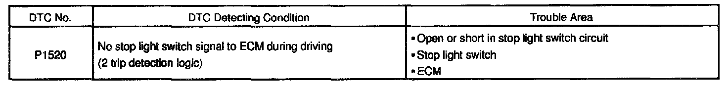 When the brake pedal is depressed, this switch sends a signal to the ECM. Then the ECM cancels the operation of the lock-up clutch while braking is in progress.