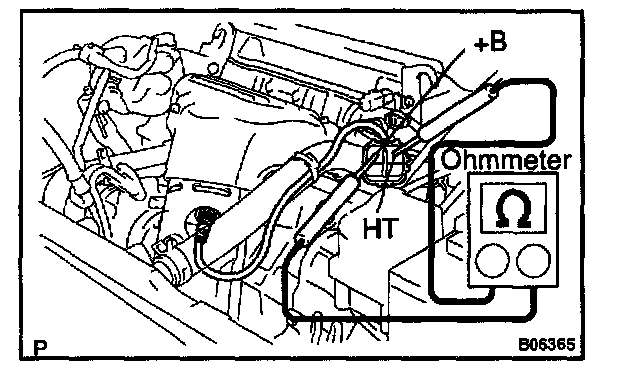b. Using an ohmmeter, measure the resistance between terminals +B and HT.