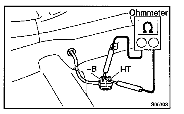 b. Using an ohmmeter, measure the resistance between terminals +B and HT.