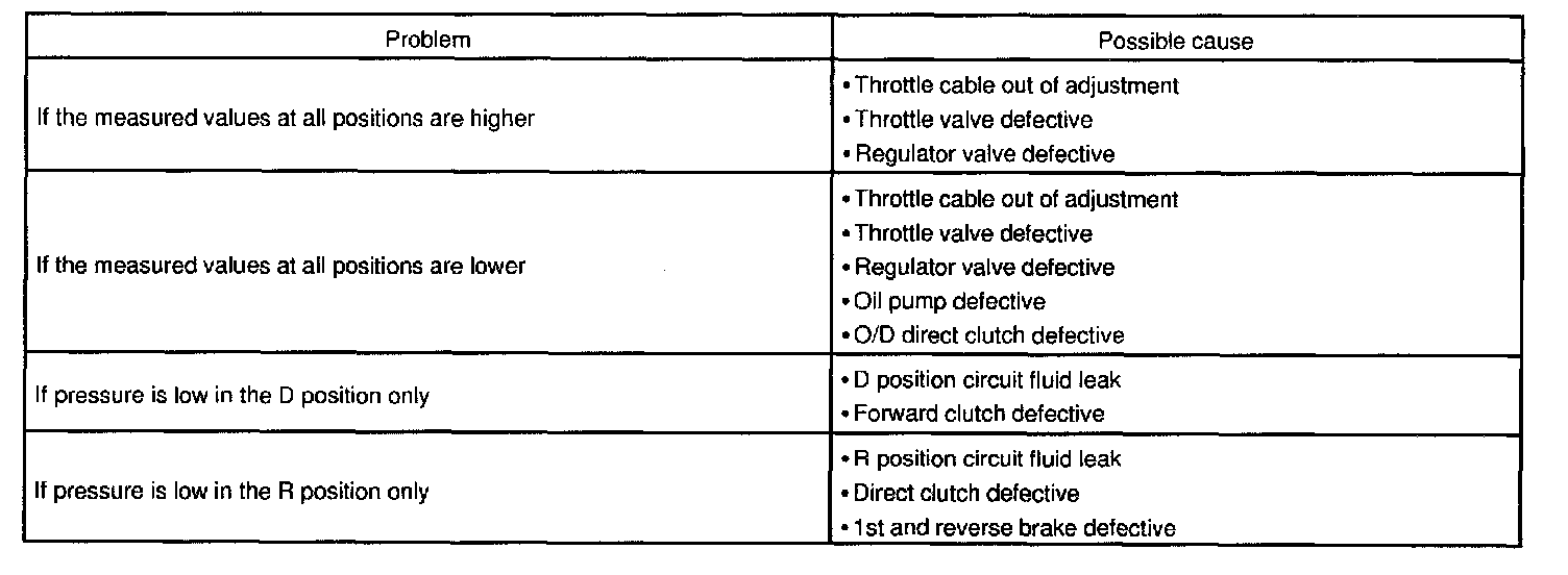 Specified line pressure:: If the measured pressure does not reach the specified value,recheck the throttle cable adjustment and then retest.