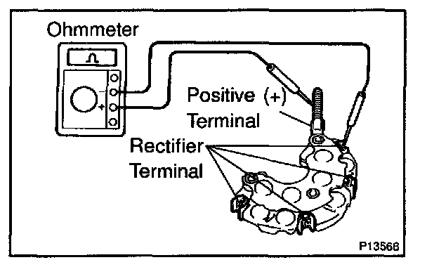 1. Using an ohmmeter, connect one tester probe to the positive (+) terminal and the other to each rectifier terminal.