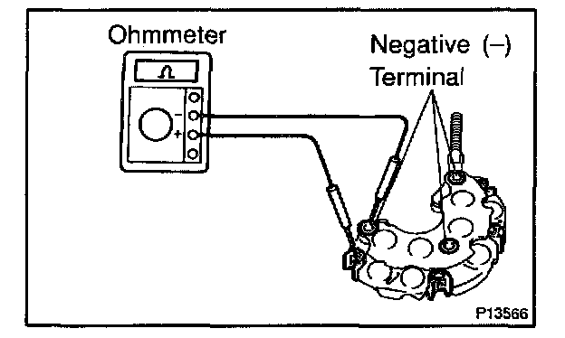 1. Using an ohmmeter, connect one tester probe to each negative (-) terminal and the other to each rectifier terminal.