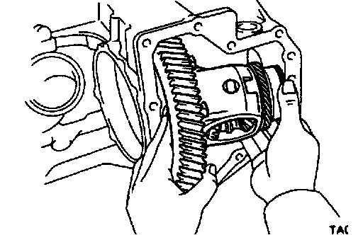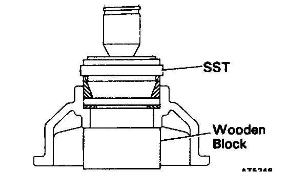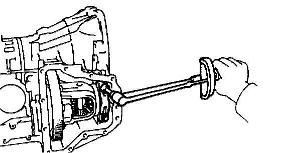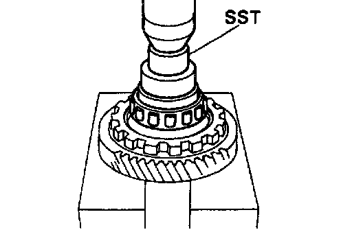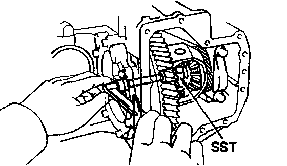 Fasten Special Service Tools (SST) under the bearing above the cutouts on the speedometer drive gear. Remove the bearing from the case.