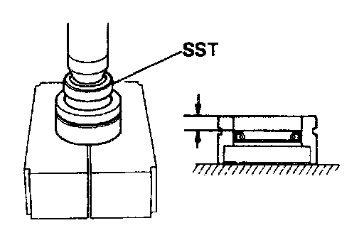 c. With the oil seal lip facing upward, use SST to press in a new oil seal until its end is flush with the surface of the cage.