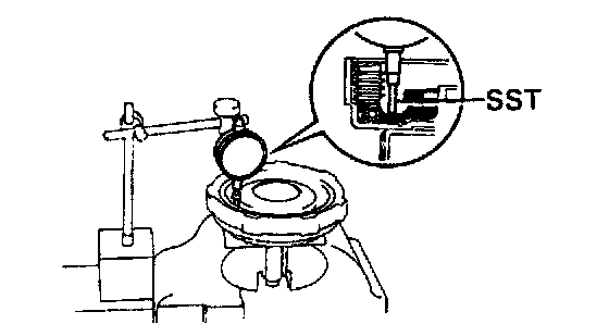 Set a dial indicator and measuring terminal (Special Service Tools) (SST) together, measure the forward clutch piston stroke while applying and releasing compressed air (392 - 785 kPa, 4 - 8 kgf/cm2, 57 - 114 psi).