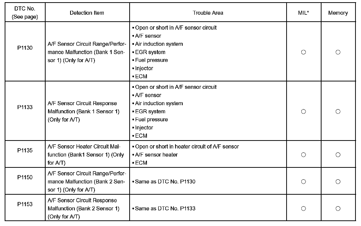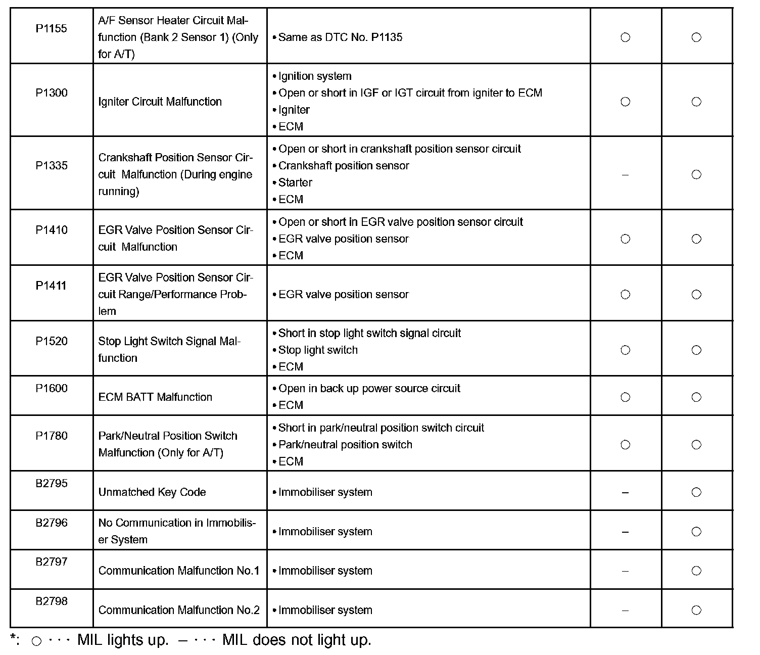 If a malfunction code is displayed during the DTC check in check mode, check the circuit for the codes listed in the table below. For details of each code, turn to the page referred to under the "See page "for the respective "DTC No." in the DTC chart.