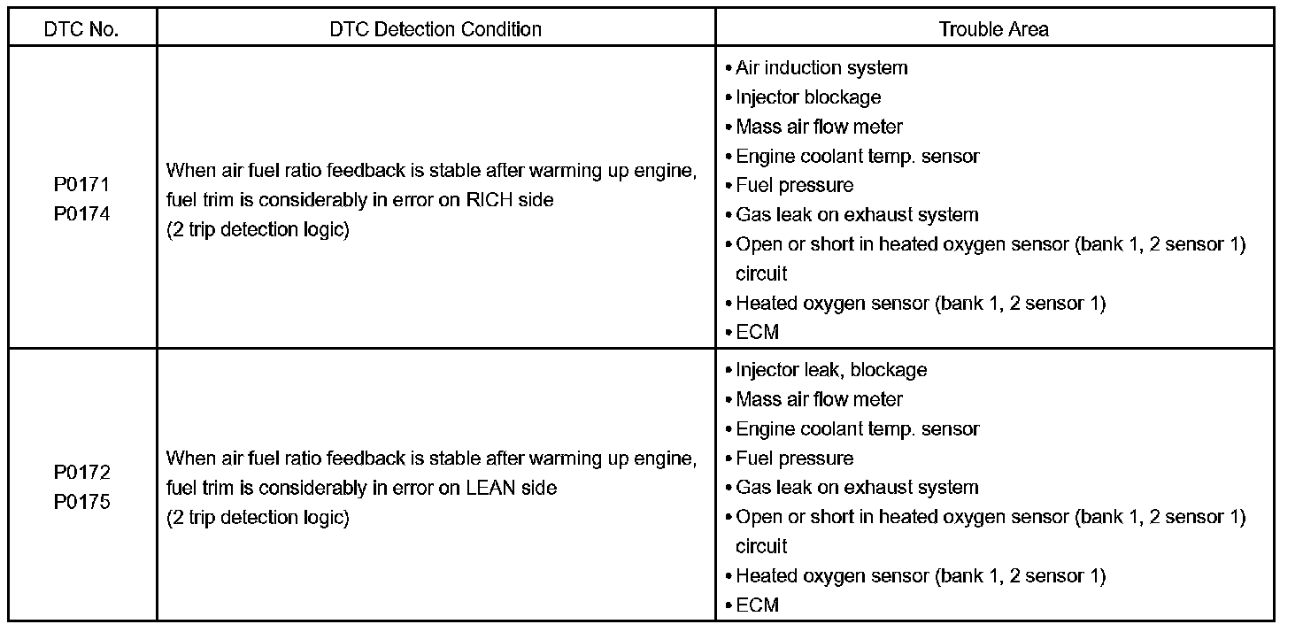 - When DTC P0171 or P0174 is recorded, the actual air-fuel ratio is on the LEAN side. When DTC P0172 or P0175 is recorded, the actual air-fuel ratio is on the RICH side.