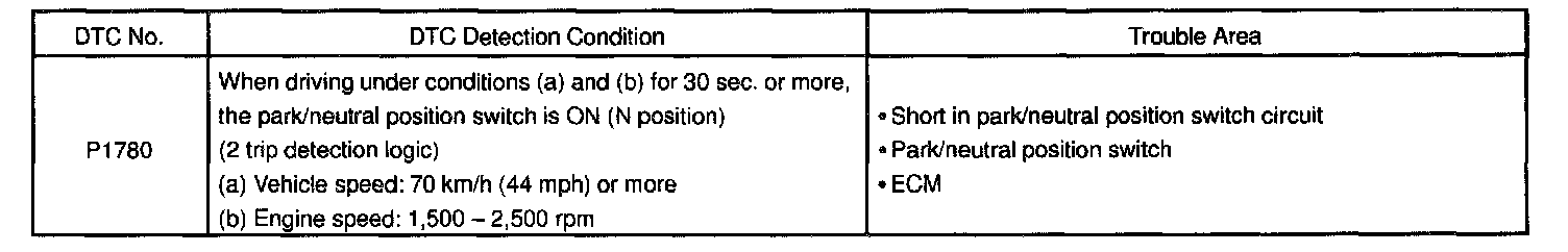 The park/neutral position switch detects the shift lever position and sends signals to the ECM. The ECM receives signals (PNP, REVERSE, 2ND and LOW) from the park/neutral position switch. When the signal is not sent to the ECM from the park/neutral position switch, the ECM judges that the shift lever is in the D position.