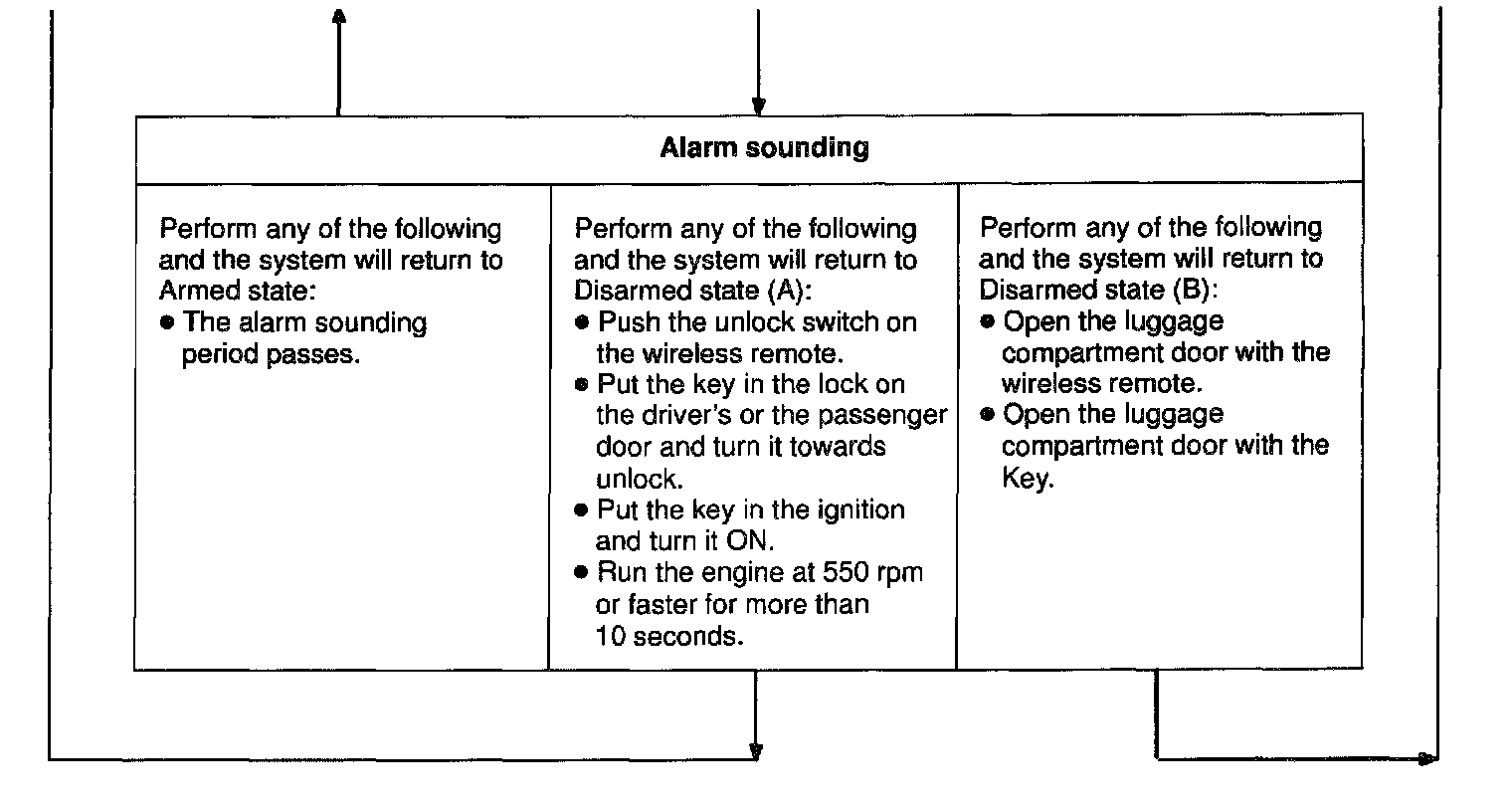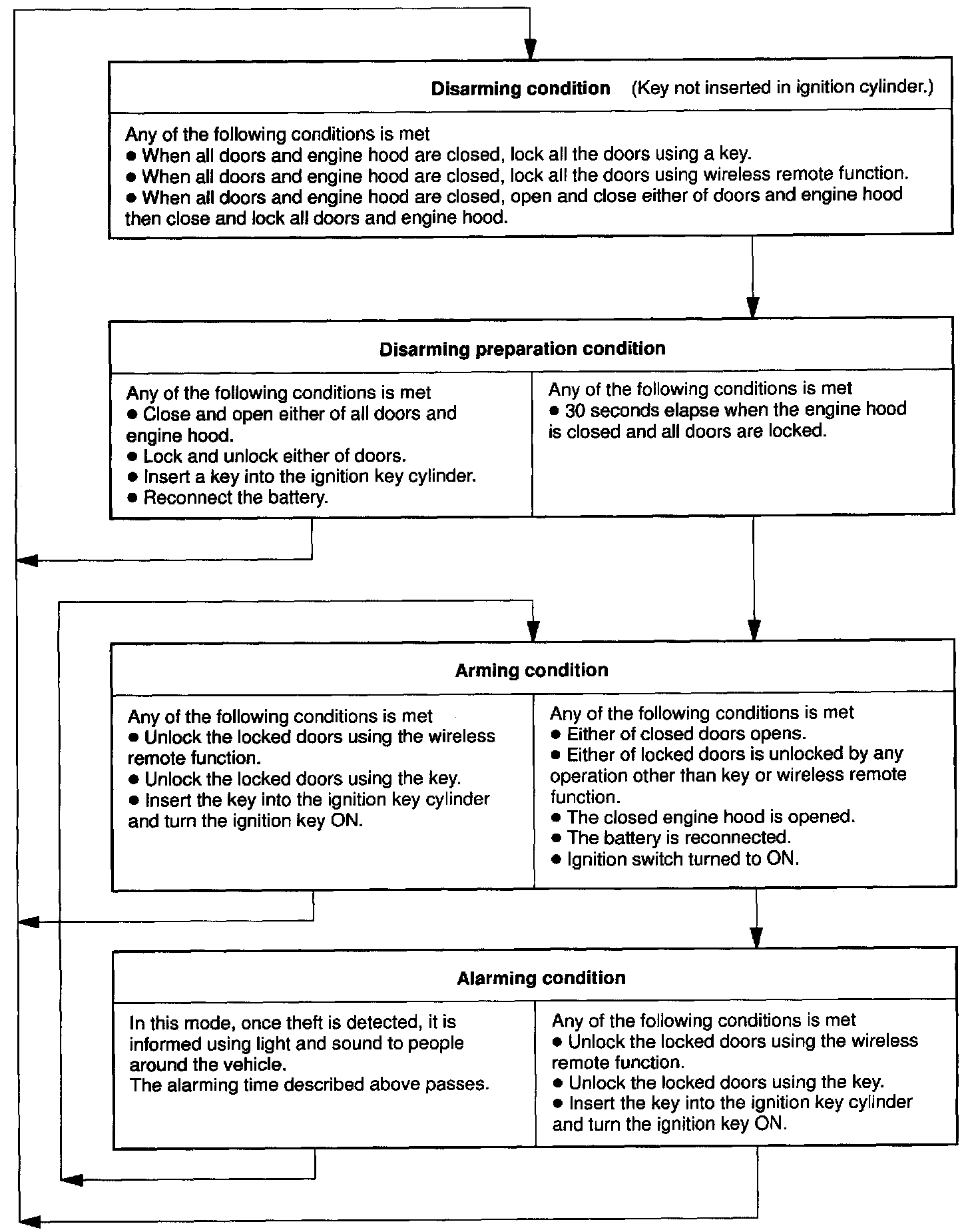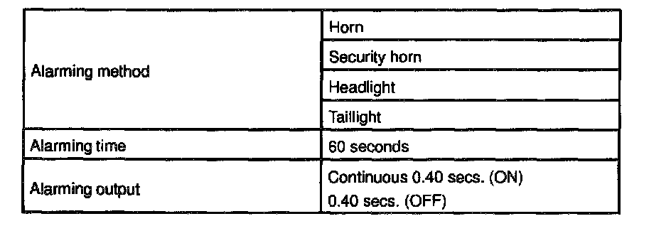 Is this condition, once theft is detected, it is informed using light and sound to people around the vehicle. Refer to the table for alarming method or time.