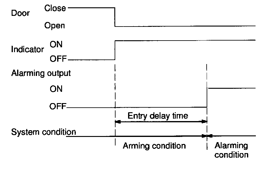 In arming condition either closed door is opened, entry delay occurs. (14 secs.)