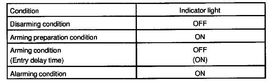 HINT: Even in disarming condition, the indicator light flash. (Due to the signal output form immobilizer system). The indicator always flashes receiving the signal from the immobilizer system at any time in the arming condition.