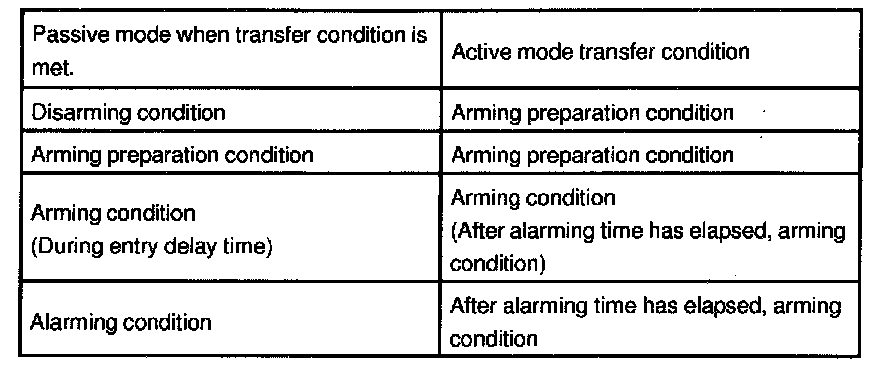 In each passive mode, when disarming condition of active mode disarming preparation transfer condition" is met, the active mode transfers to each condition. In this case, active mode continues till disarming condition.