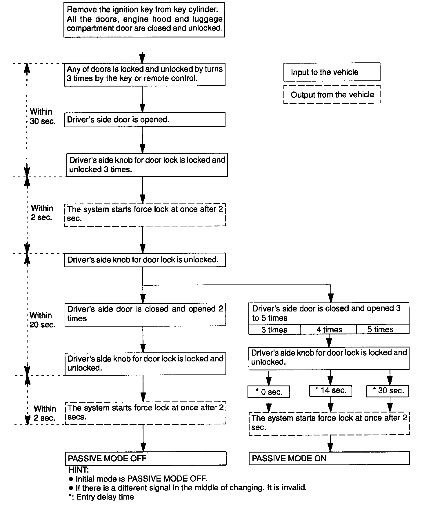 At the same time the system locks all doors (If all door are not locked at once, the system repeats door locking operation every 6.38 seconds during the one minute alarm time). There are 2 modes in this system, which are active mode and passive mode.