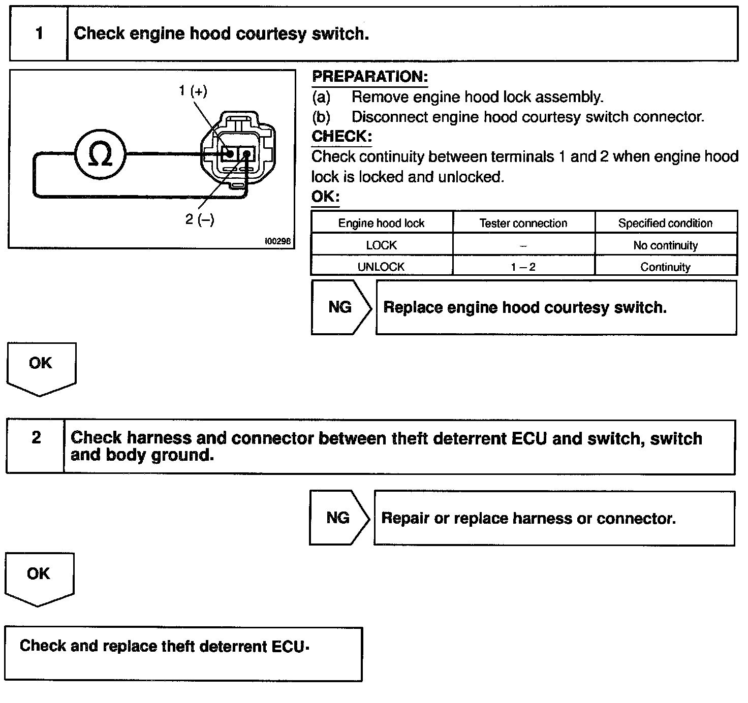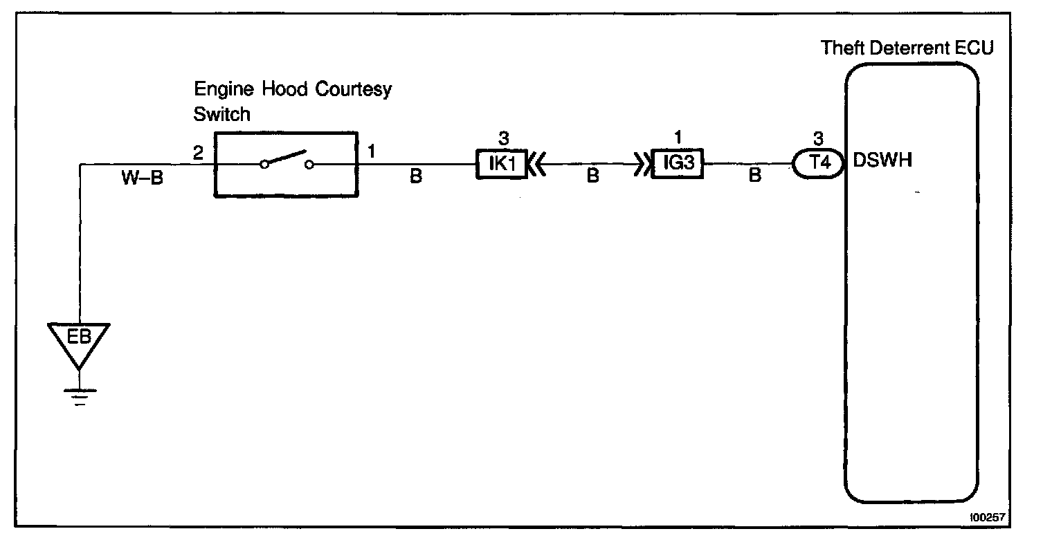 CIRCUIT DESCRIPTIONThe engine hood courtesy switch is built into the engine hood lock assembly and goes ON when the engine hood is opened and goes OFF when the engine hood is closed.